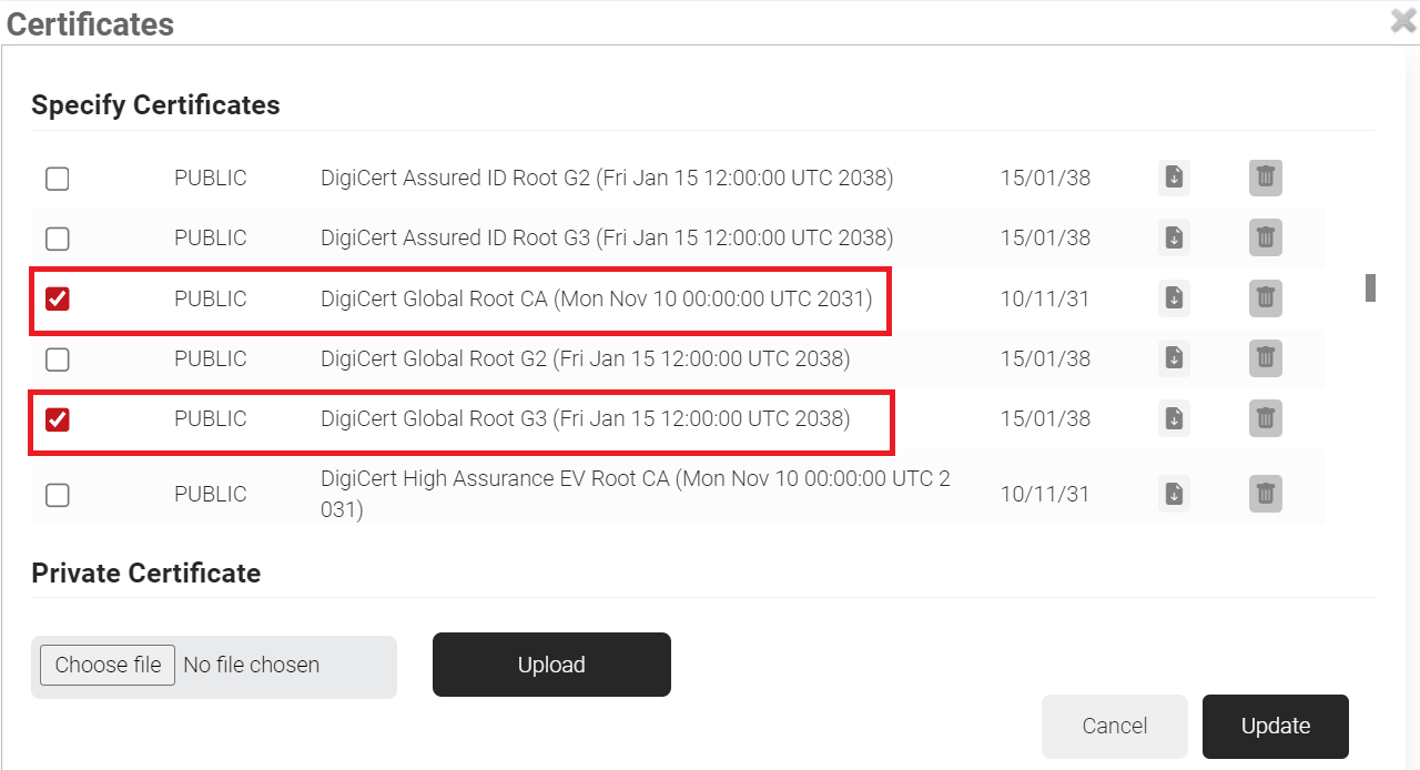 - Select the DigiCert Global Root CA (Mon Nov 10 00:00:00 UTC 2031) and DigiCert Global Root G3 (Fri Jan 15 12:00:00 UTC 2038) checkboxes as shown in the following screen.
