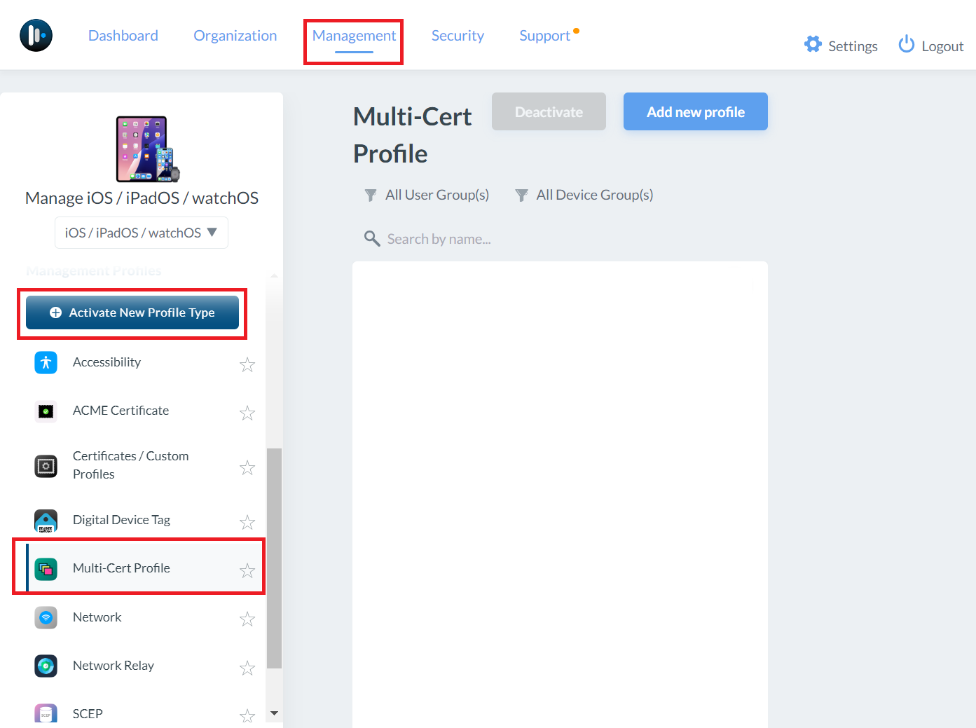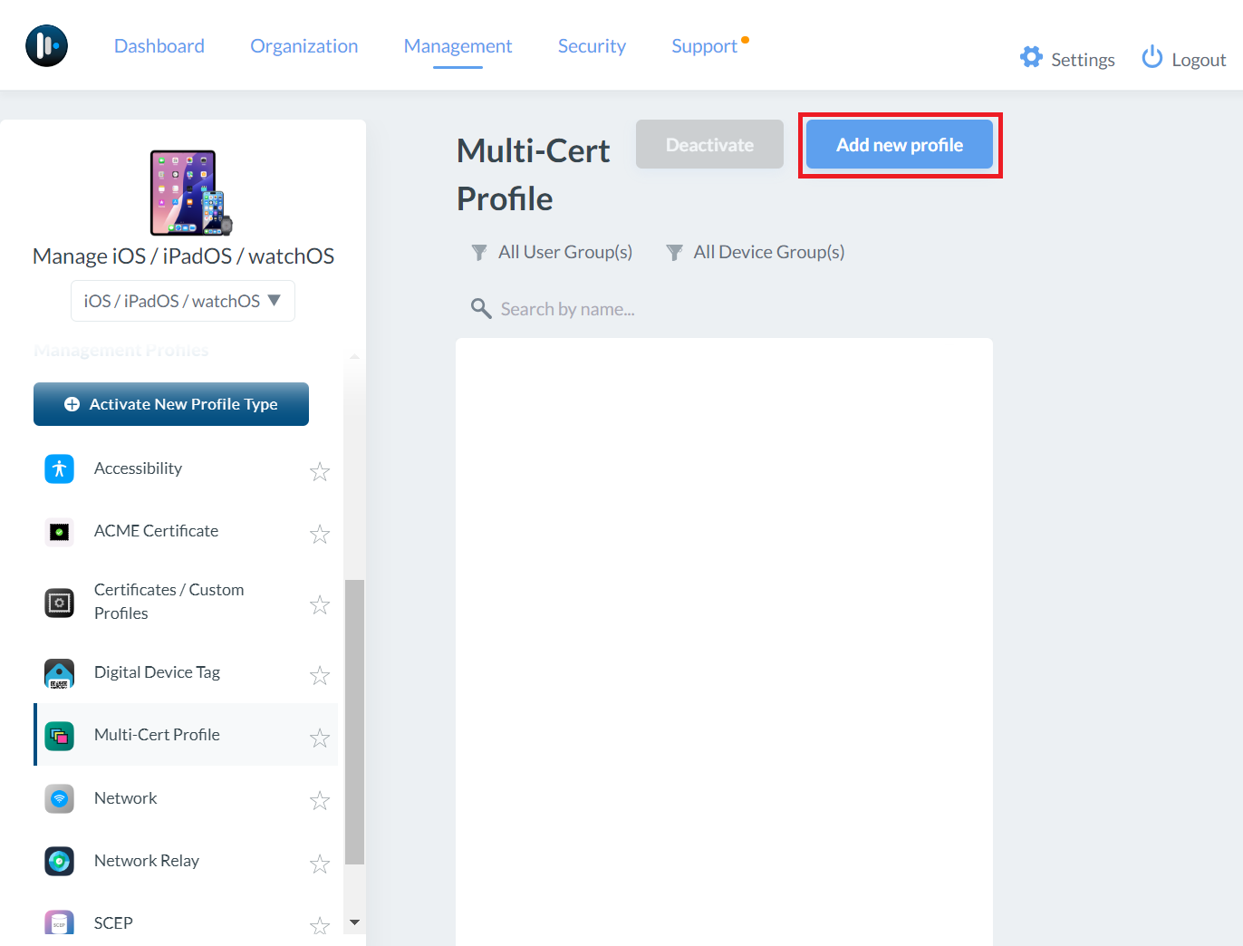 - To add a new profile, navigate to Management > Management Profiles and select Multi-Cert Profile.