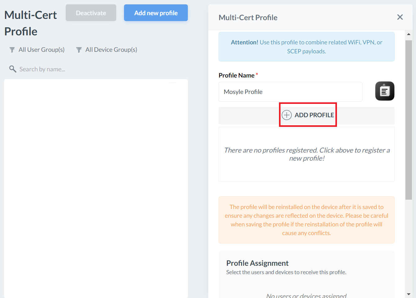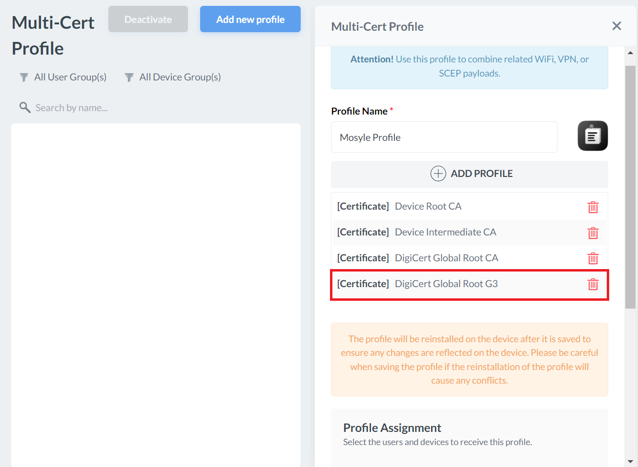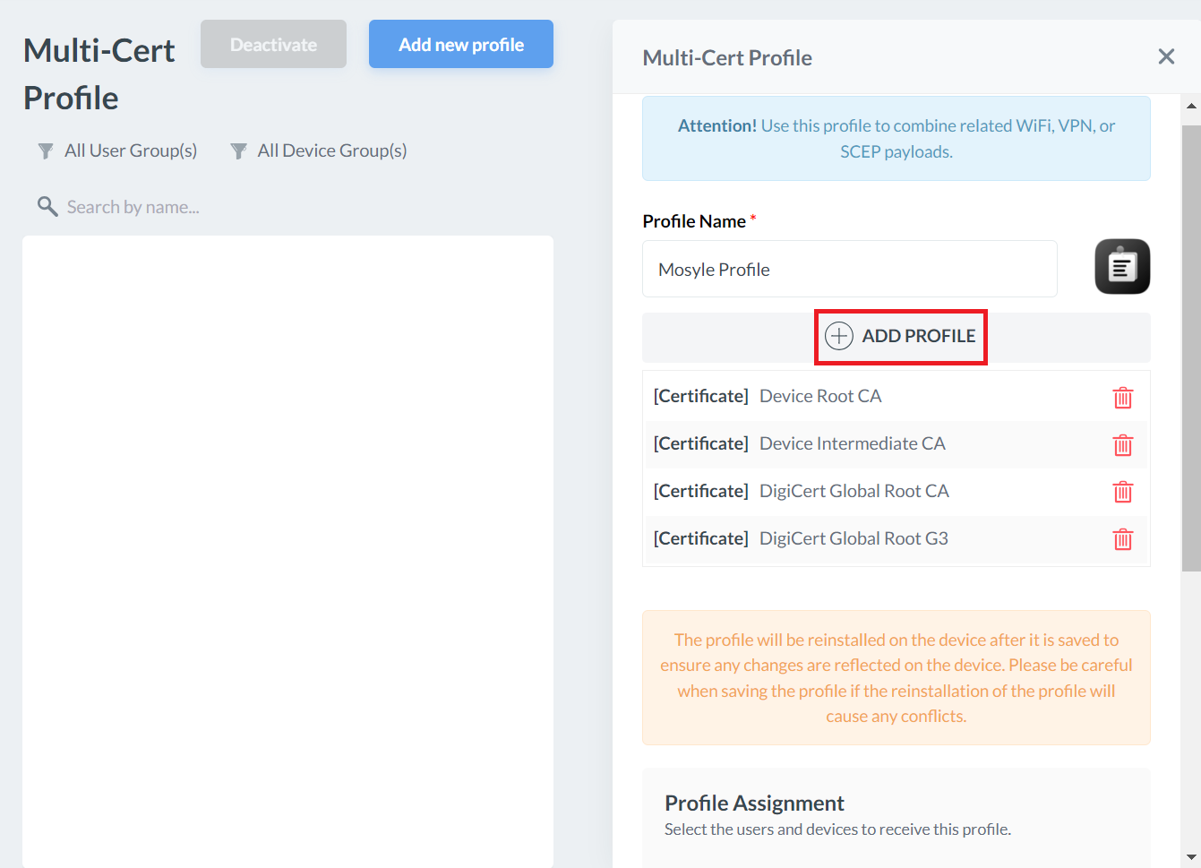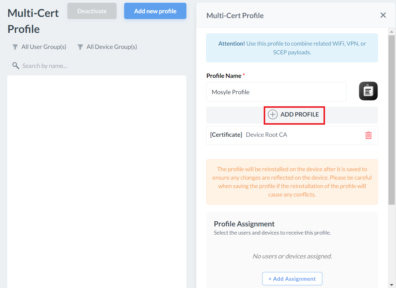 - On the Multi-Cert Profile page, scroll down to the Profile Assignment section.