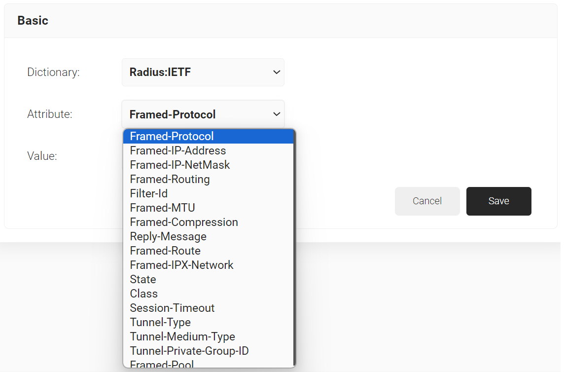 - From the Dictionary drop-down list, select RADIUS:IETF or Custom.