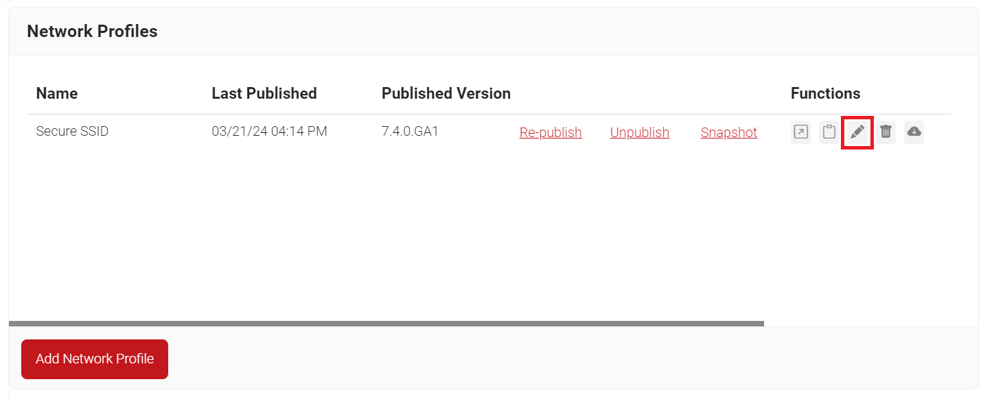 - On the Network Profiles page, click the Edit link of the network profile configured earlier.