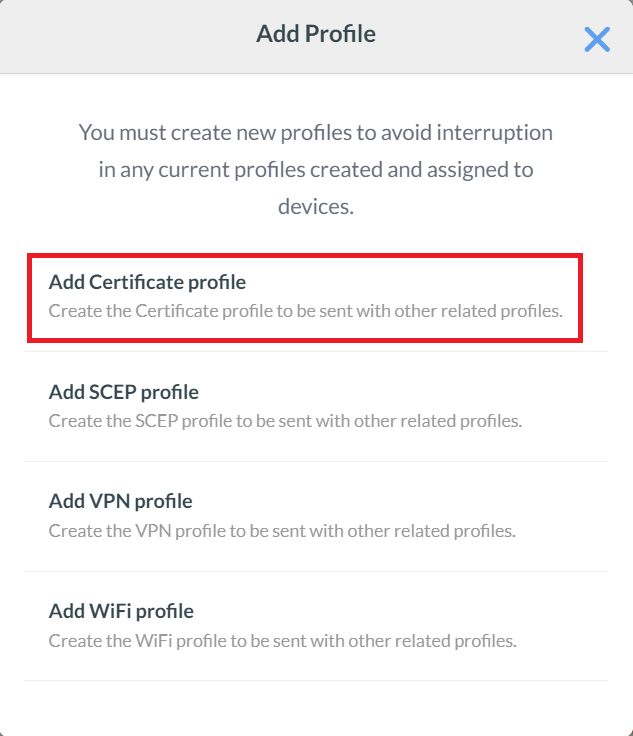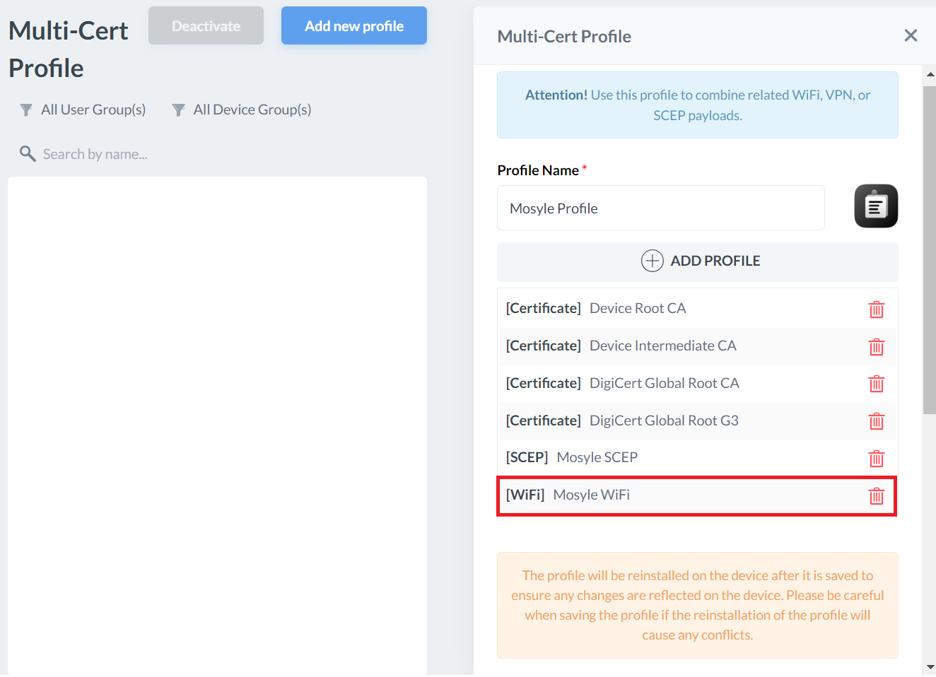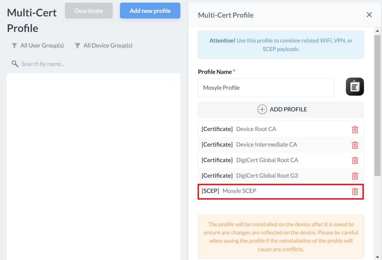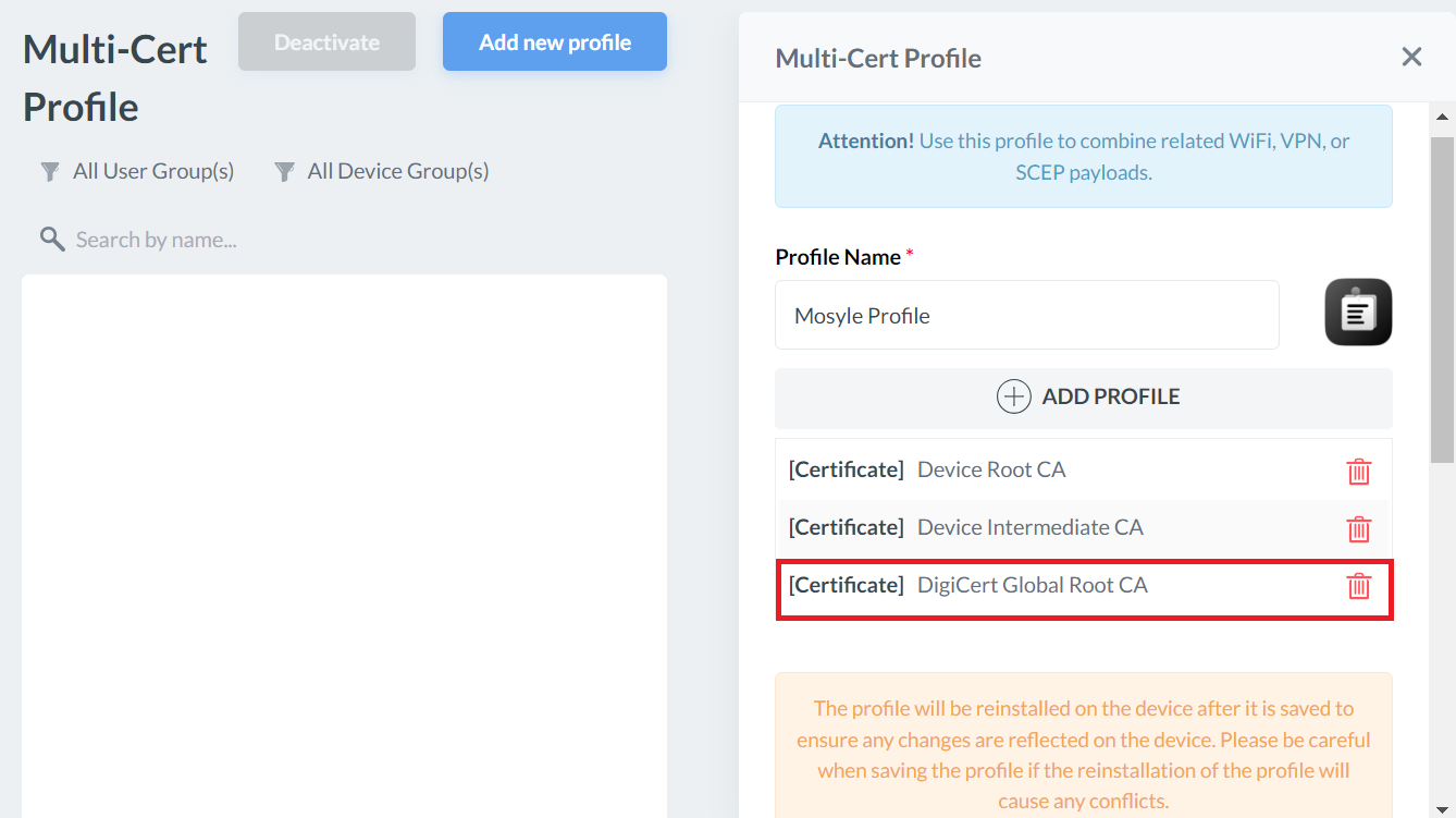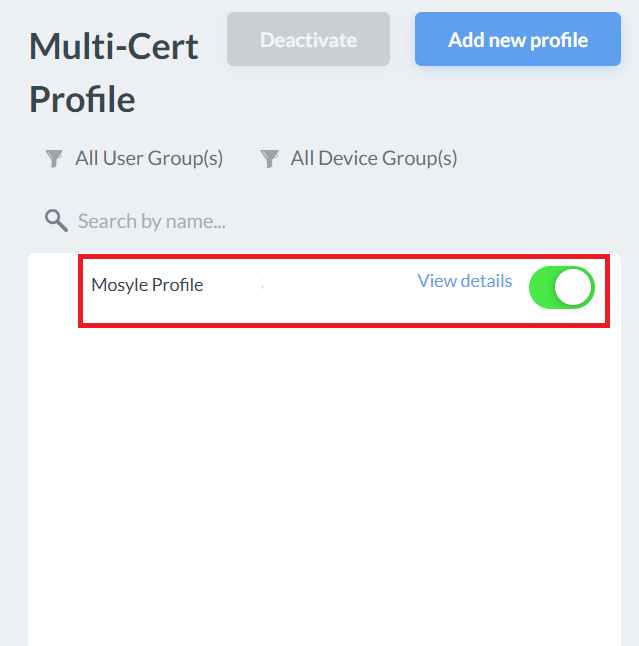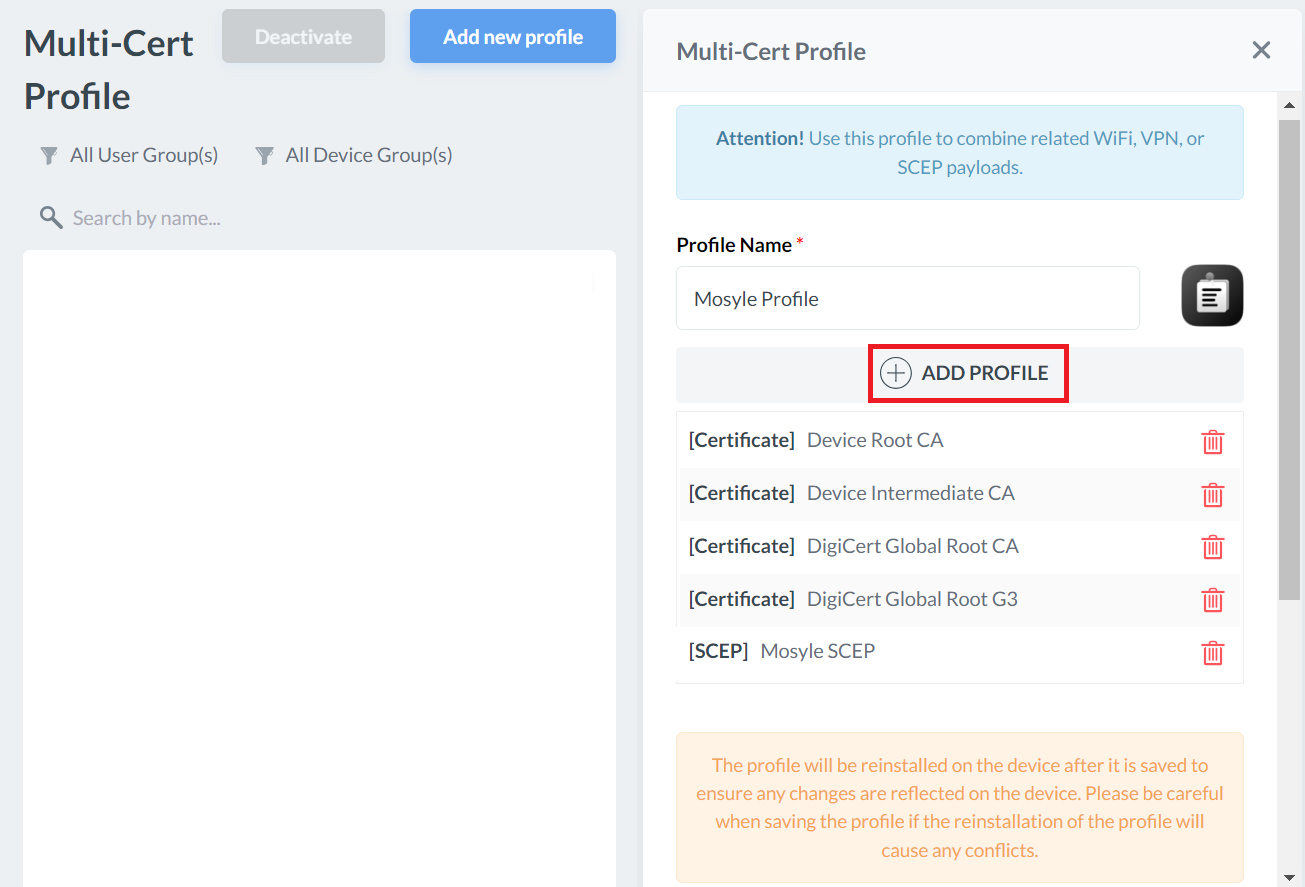 NOTE: If the Multi-Cert Profile option isn’t available, you might need to activate that profile type. - Click Add new profile.