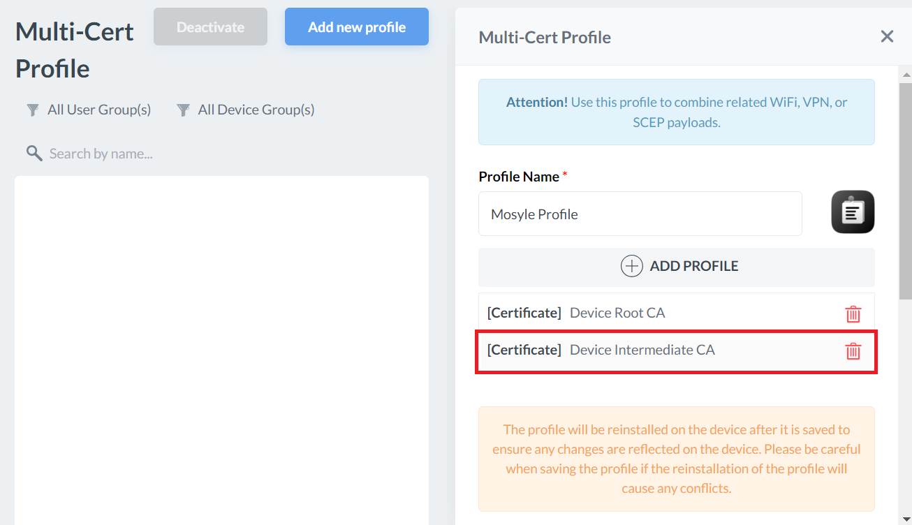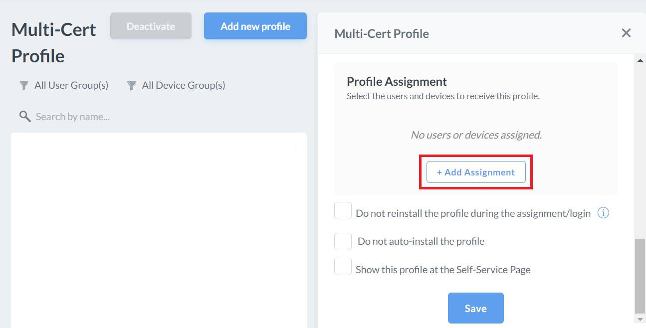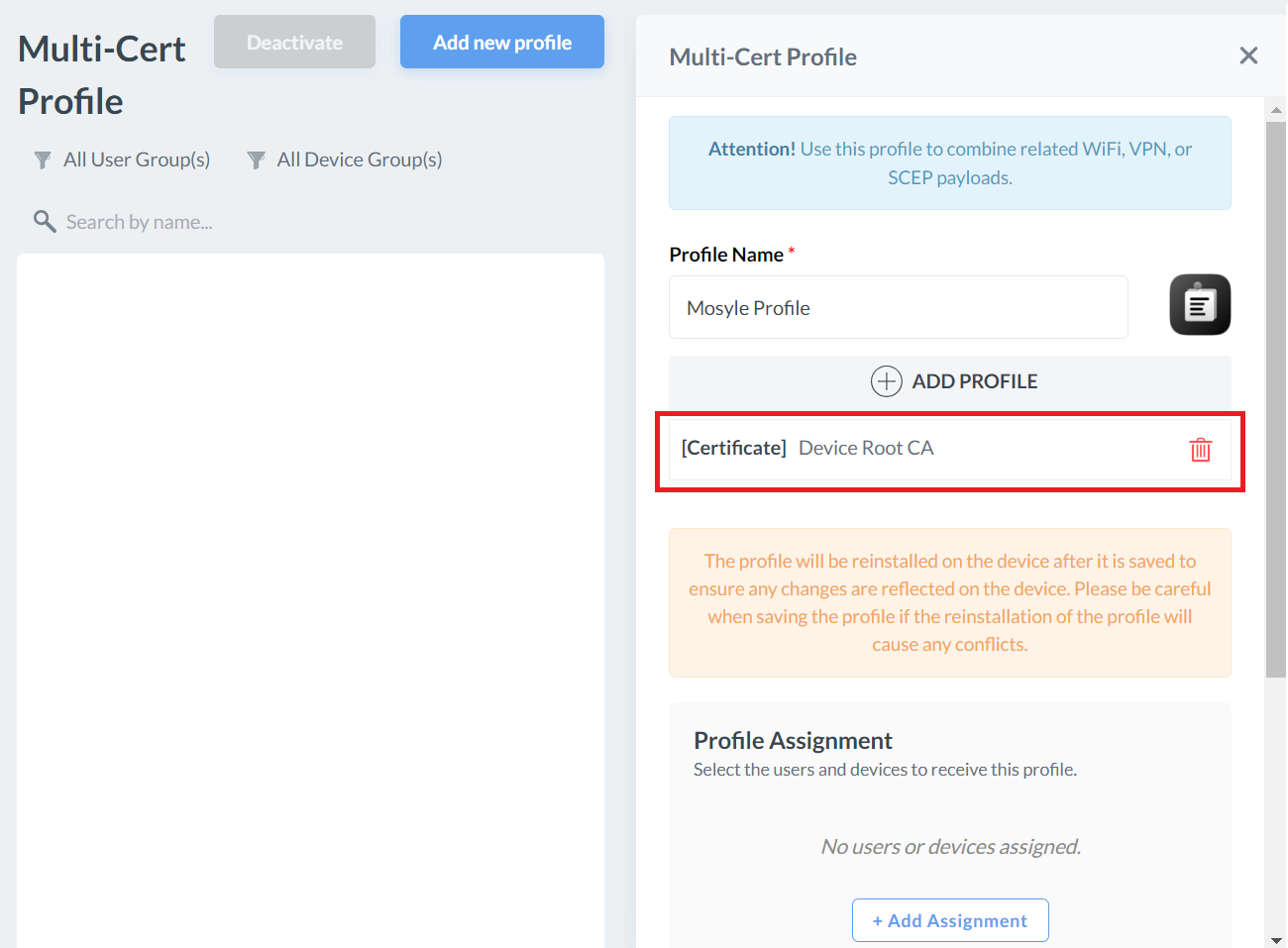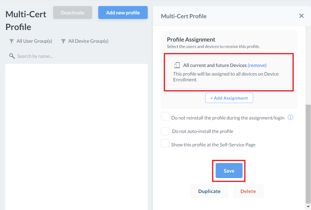 The created Multi-cert profile can then be assigned to specific users or devices that require the created certificate.