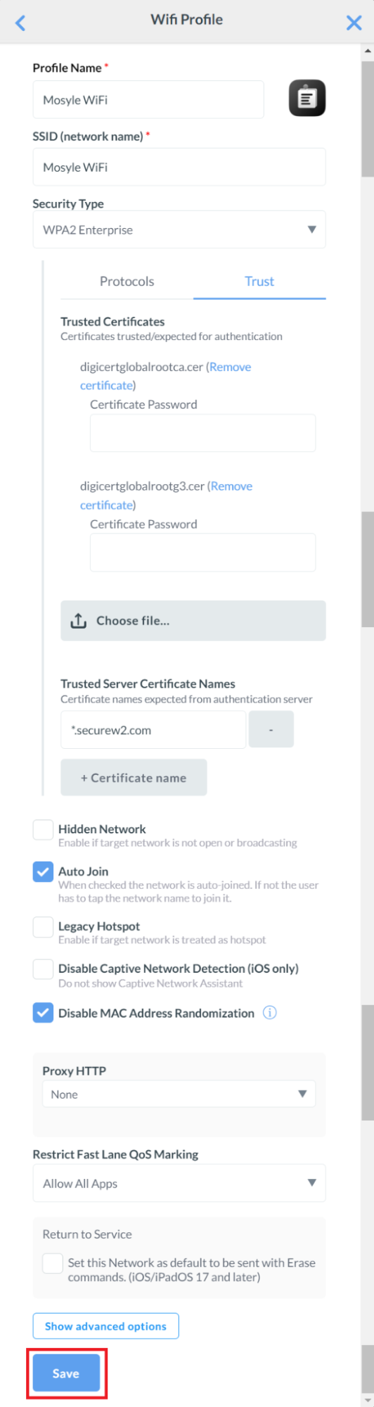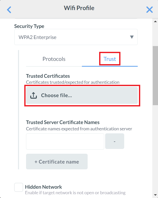 You should configure the Trusted Certificate Profile with the certificate of your RADIUS server certificate’s issuing authority. This is to make the devices trust your RADIUS server by validating the RADIUS server certificate. We achieve this server validation in the profile configuration by adding the Root and/or Intermediate Certificate Authority (CA) certificates that issued the RADIUS server certificate. When you assign this profile, the Mosyle managed devices receive the trusted certificates.