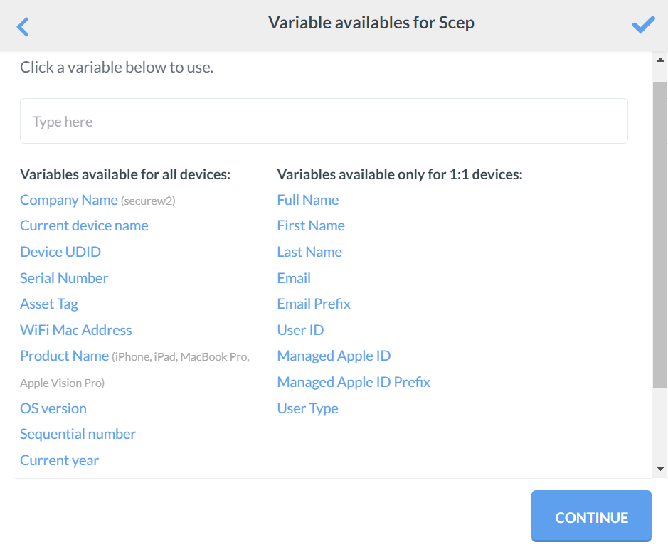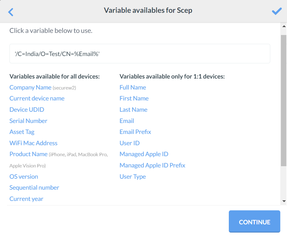 - Click CONTINUE after selecting the variable. For demonstration purposes, the WiFi Mac Address and Product Name variables are selected as Subject Alternative Name Values.