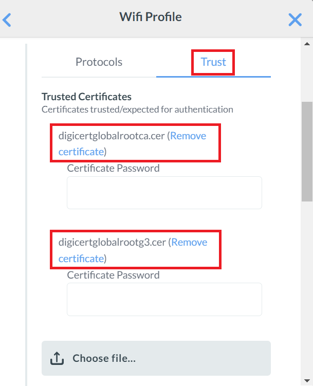 - In the Trust Certificates section, click Choose file and select both the existing and new Global Root CA certificates.