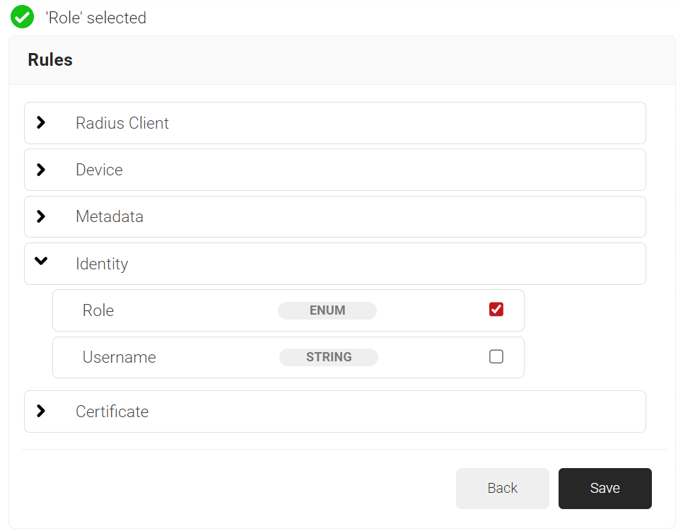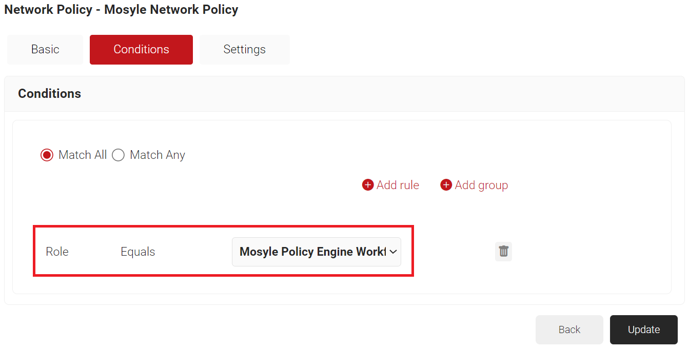 - From the Role Equals drop-down list, select the user role policy you created earlier (refer to the Configuring a Policy Workflows section). You can select multiple User Roles to assign to a Network Policy.
