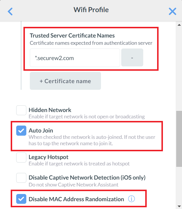 - In the Trusted Server Certificate Names textbox, enter *.securew2.com.