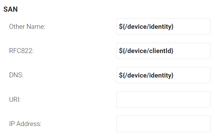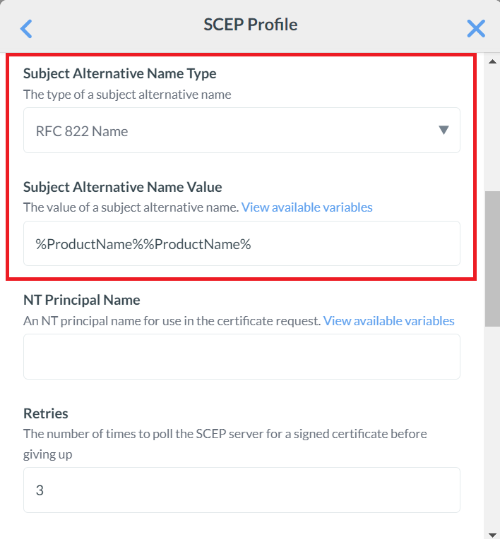 - Make sure that the SCEP profile (in the Mosyle Portal) is configured to send values in the SAN attribute using an Email address (RFC822). For more information, see the Creating an Intermediate CA for Mosyle SCEP Gateway Integration section.