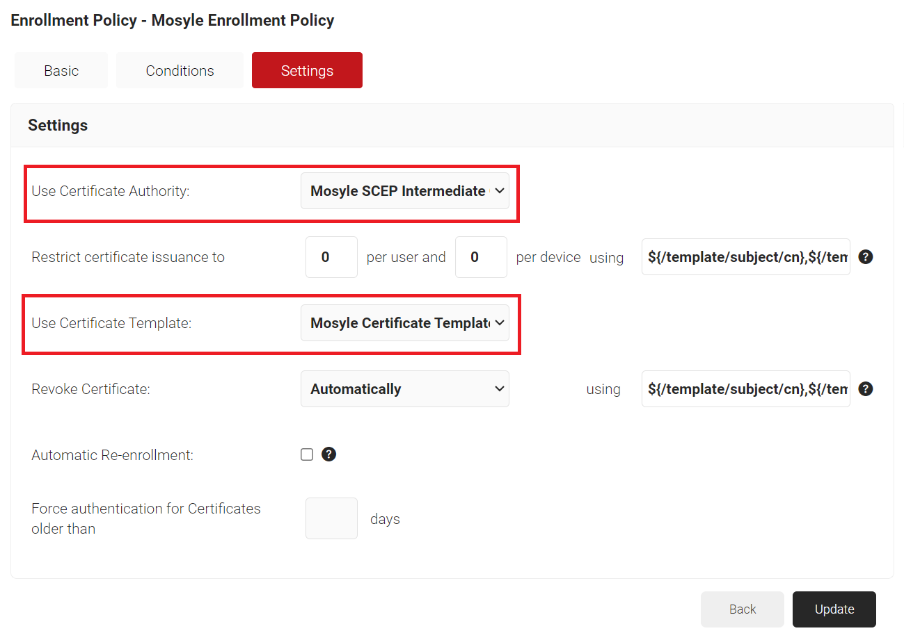 - In the Settings section, from the Use Certificate Authority drop-down list, select the intermediate CA you created earlier (refer to the Creating an Intermediate CA for Mosyle SCEP Gateway Integration section).