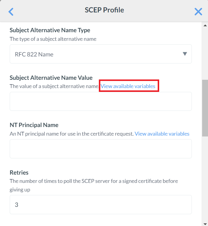 - In the Profile Name field, enter a name for your SCEP profile. SecureW2 recommends a name involving SCEP for easier identification in the future.