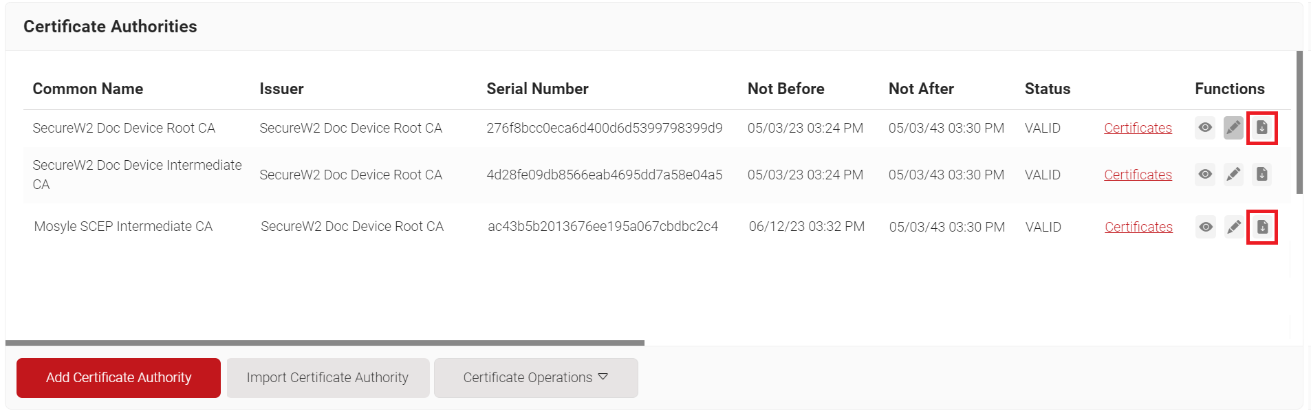 - In the Certificate Authorities section, click the Download link for the Root CA and Intermediate CA issued to your organization (see the Creating an Intermediate CA for Mosyle SCEP Gateway Integration section).