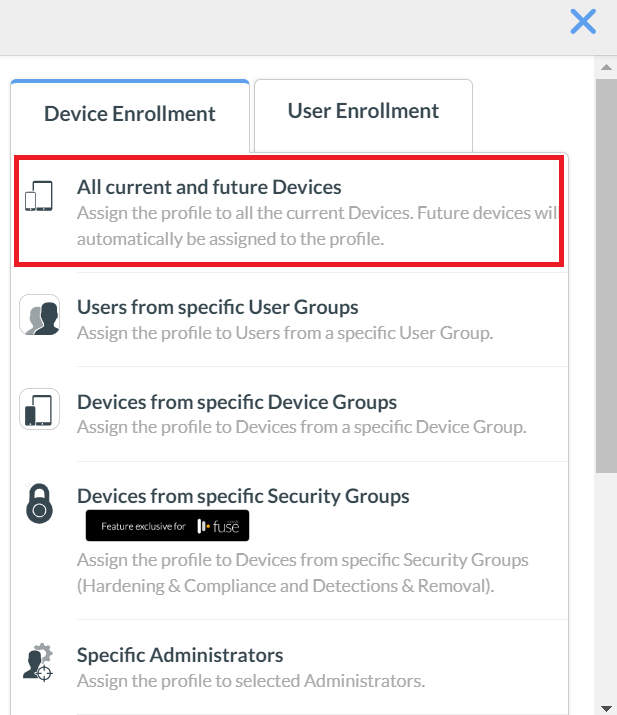 - Click the Device Enrollment tab, and select All current and future Devices to assign the profile.