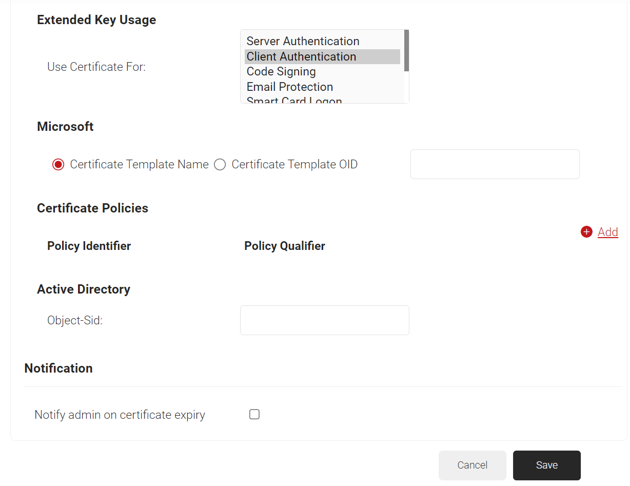 - In the Extended Key Usage section, from the Use Certificate For list, select Client Authentication.