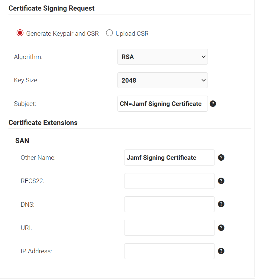 - In the Subject field, enter CN=${/device/clientId:/csr/subject/commonname}. This fetches the common name configured in the Jamf.
