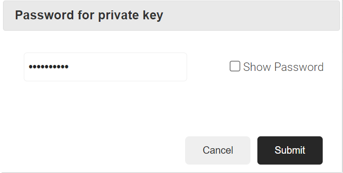 - Click the Create button, and a Password for private key pop-up window opens. Enter the password for the certificate file and click Submit.