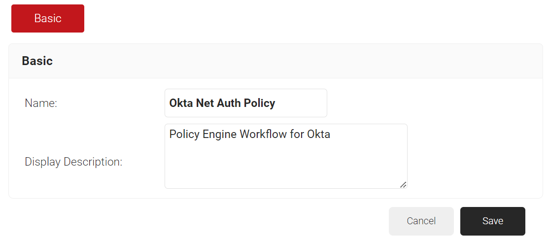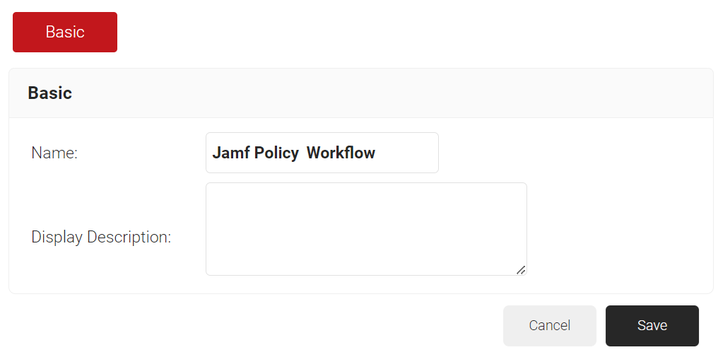 - In the Basic section, enter the name of the Policy Workflow in the Name field.