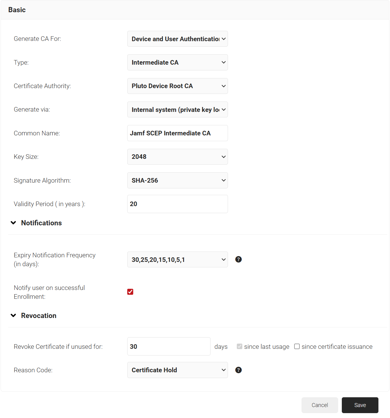 - In the Basic section, from the Generate CA For drop-down list, select the Device and User Authentication option to authenticate devices and users.