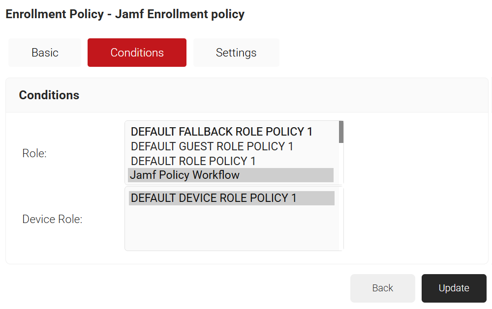 - From the Role Equals drop-down list, select the Policy Workflow you created earlier (refer to the Configuring Policy Workflow section). You can select multiple Policy Workflows to assign to a Network Policy.
