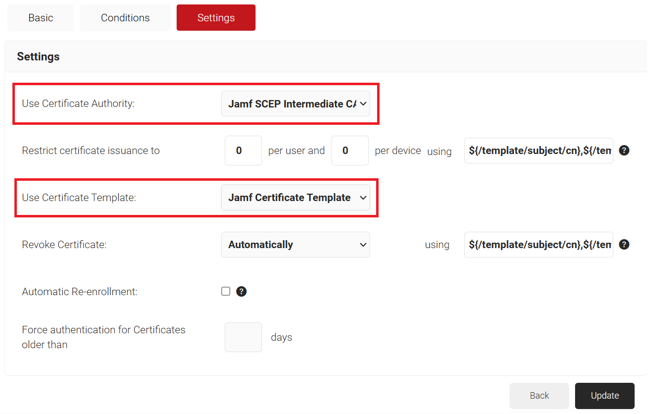 - From the Use Certificate Template drop-down list, select the certificate template created in Creating a Certificate Template for Jamf.