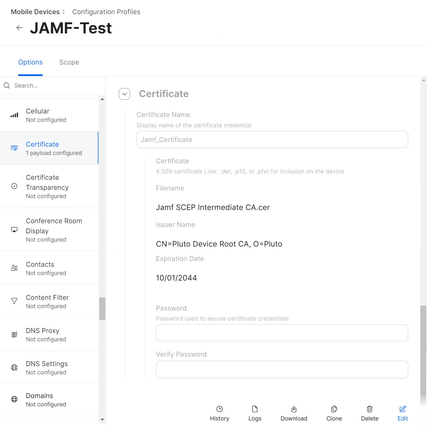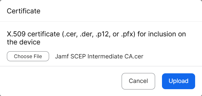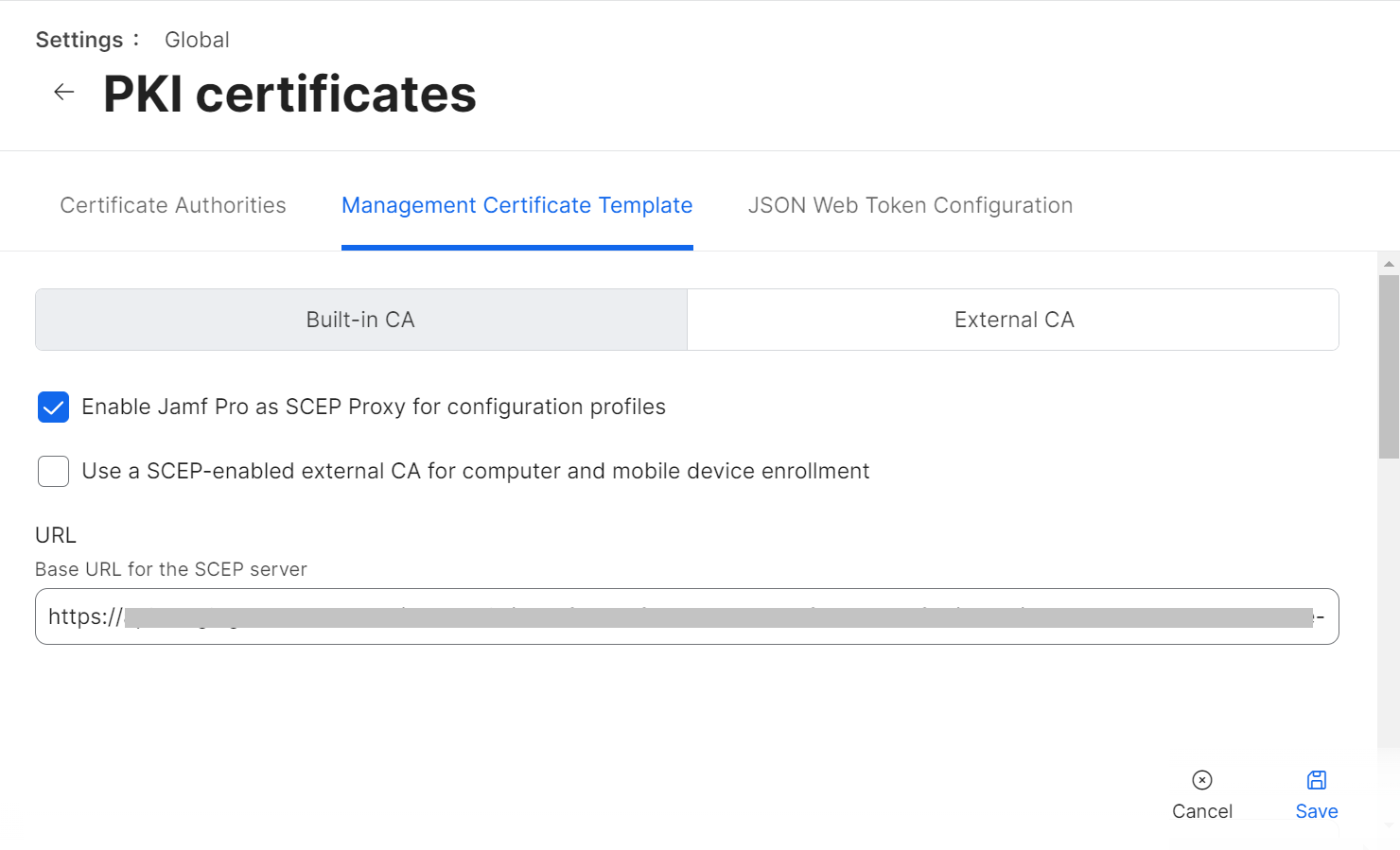 The SCEP URL serves as an endpoint using which managed devices can connect with the SCEP server and enroll for certificates. The secret is also passed to Jamf’s external CA to authenticate these certificate requests.