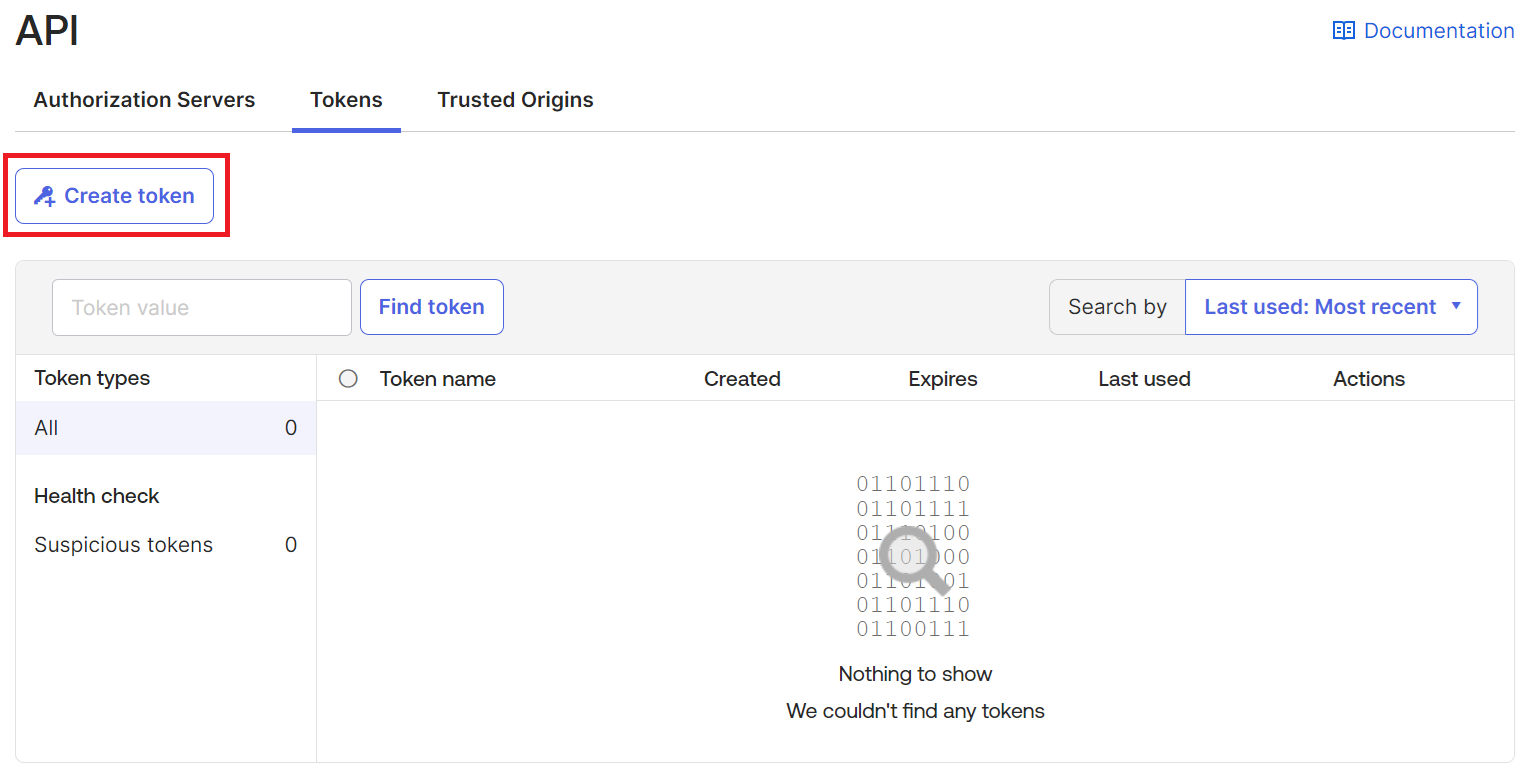 - Select the Tokens tab and on the displayed screen, click the Create token button.