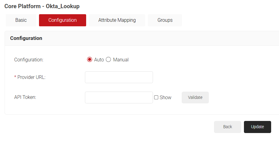 - Auto – Uses API token to automatically configure lookup with the Okta portal. Generating an API Token needs Super Admin privileges in the Okta Portal.For Auto Configuration: