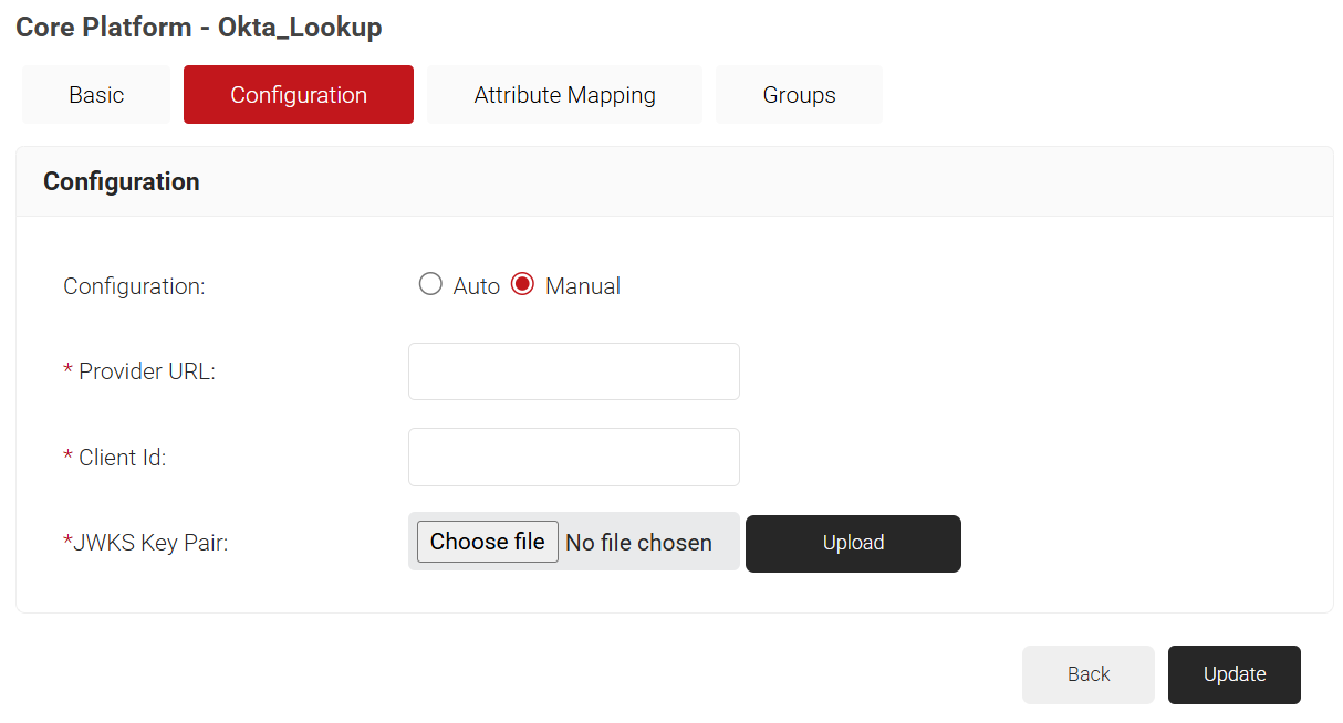 - For the JWKS Key Pair field, click Choose File. Upload the Key Pair file saved from Okta.