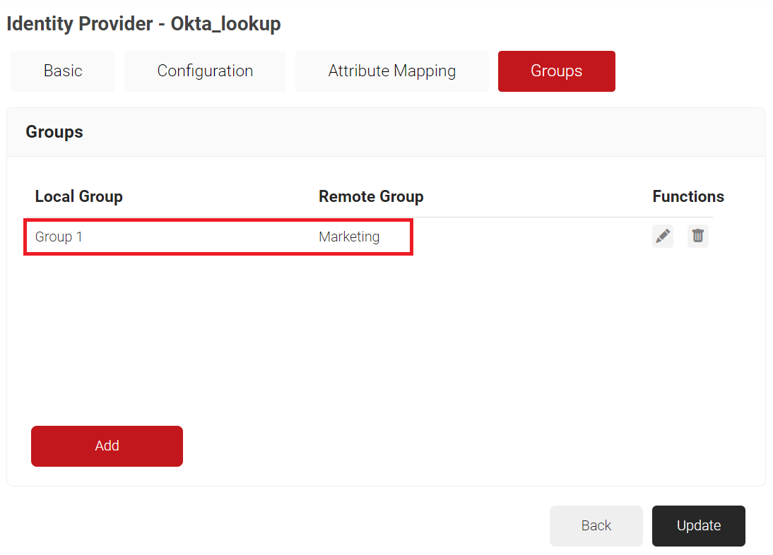 - The page refreshes and displays the Configuration, Attribute Mapping, and Groups tabs.