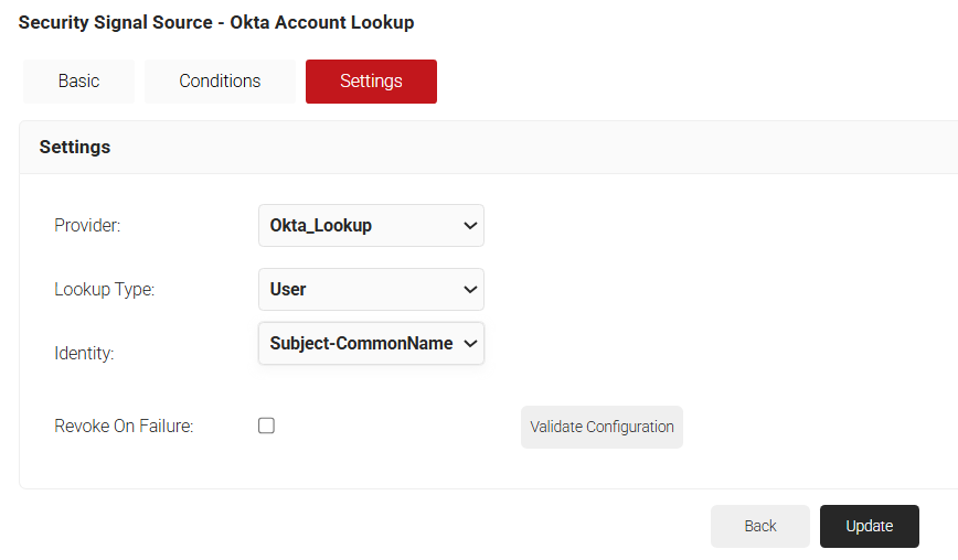 - Select the Revoke On Failure checkbox to automatically revoke a certificate if an account lookup fails, if necessary.