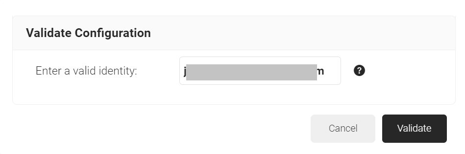 - On the Validate Configuration pop-up window, in the Enter a valid identity field, enter the identity (user/device) to validate the lookup, and click Validate.