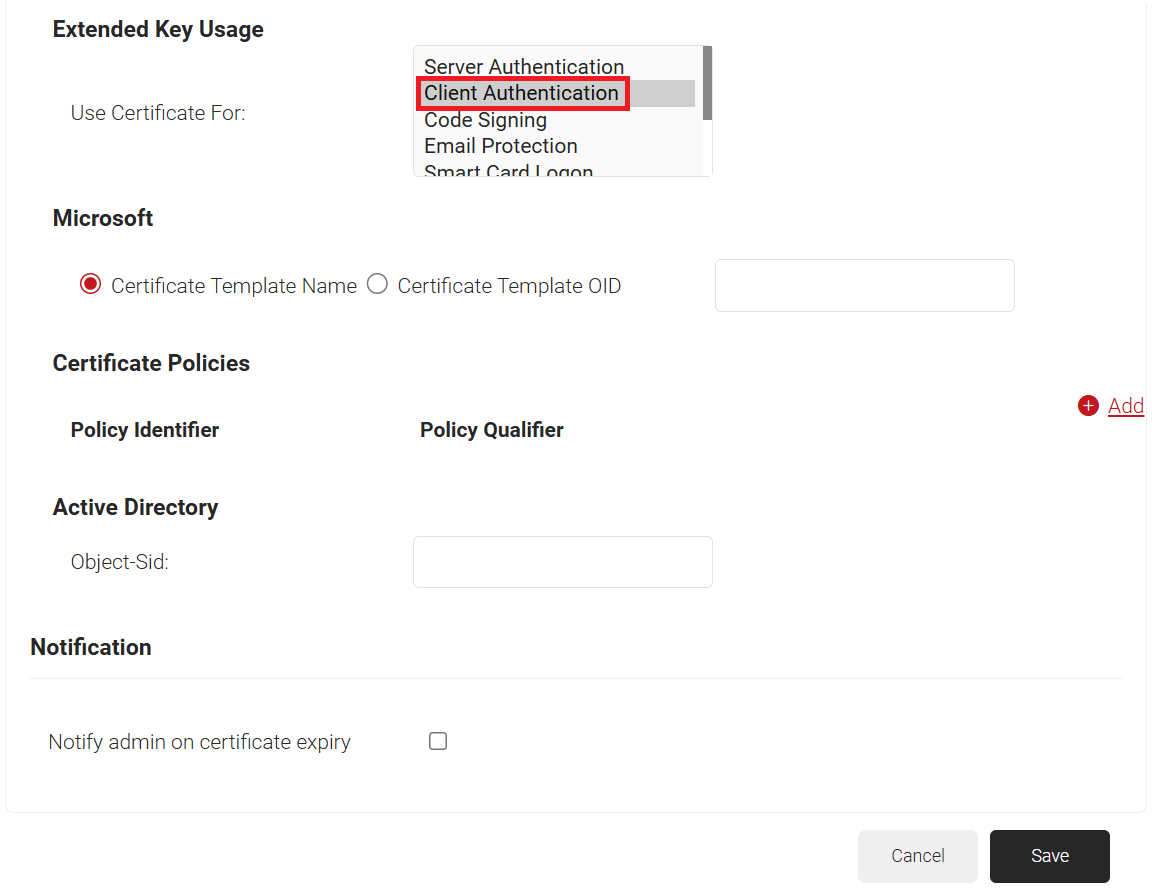 - In the Extended Key Usage section, from the Use Certificate For list, select Client Authentication.