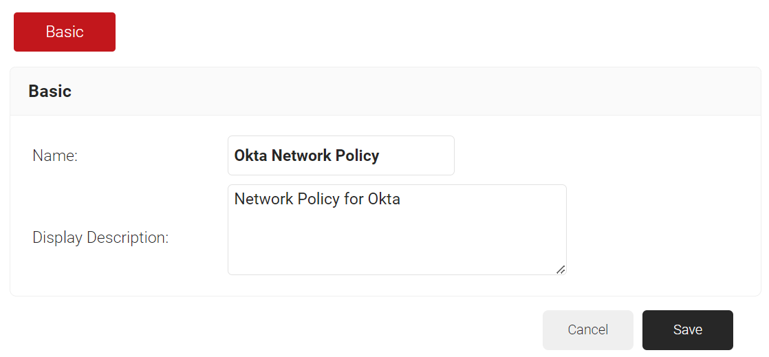 - In the Basic section, in the Name field, enter the name of the network policy.