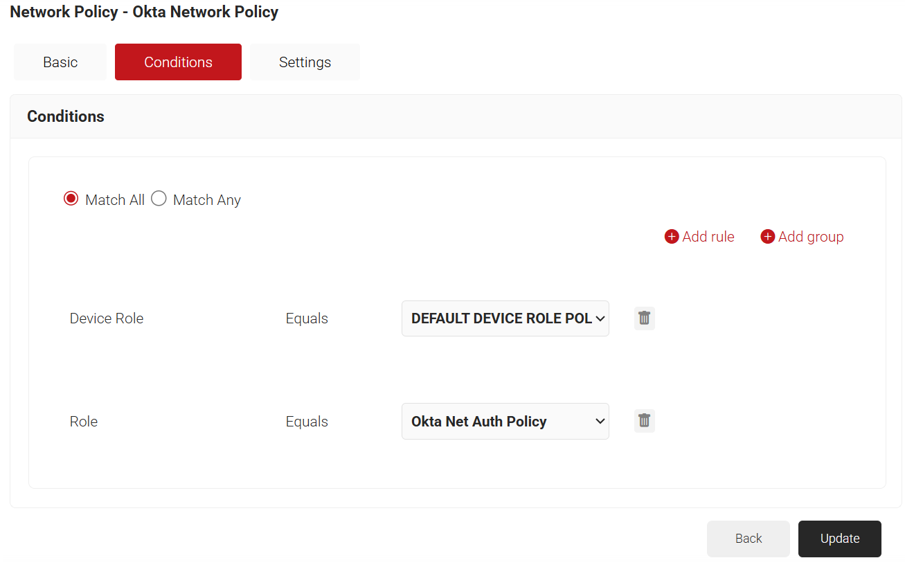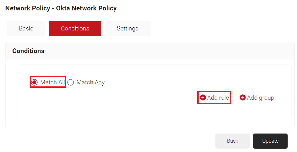 - Select Match All or Match Any based on your requirements to set authentication criteria. In the case explained here, we are selecting Match All.