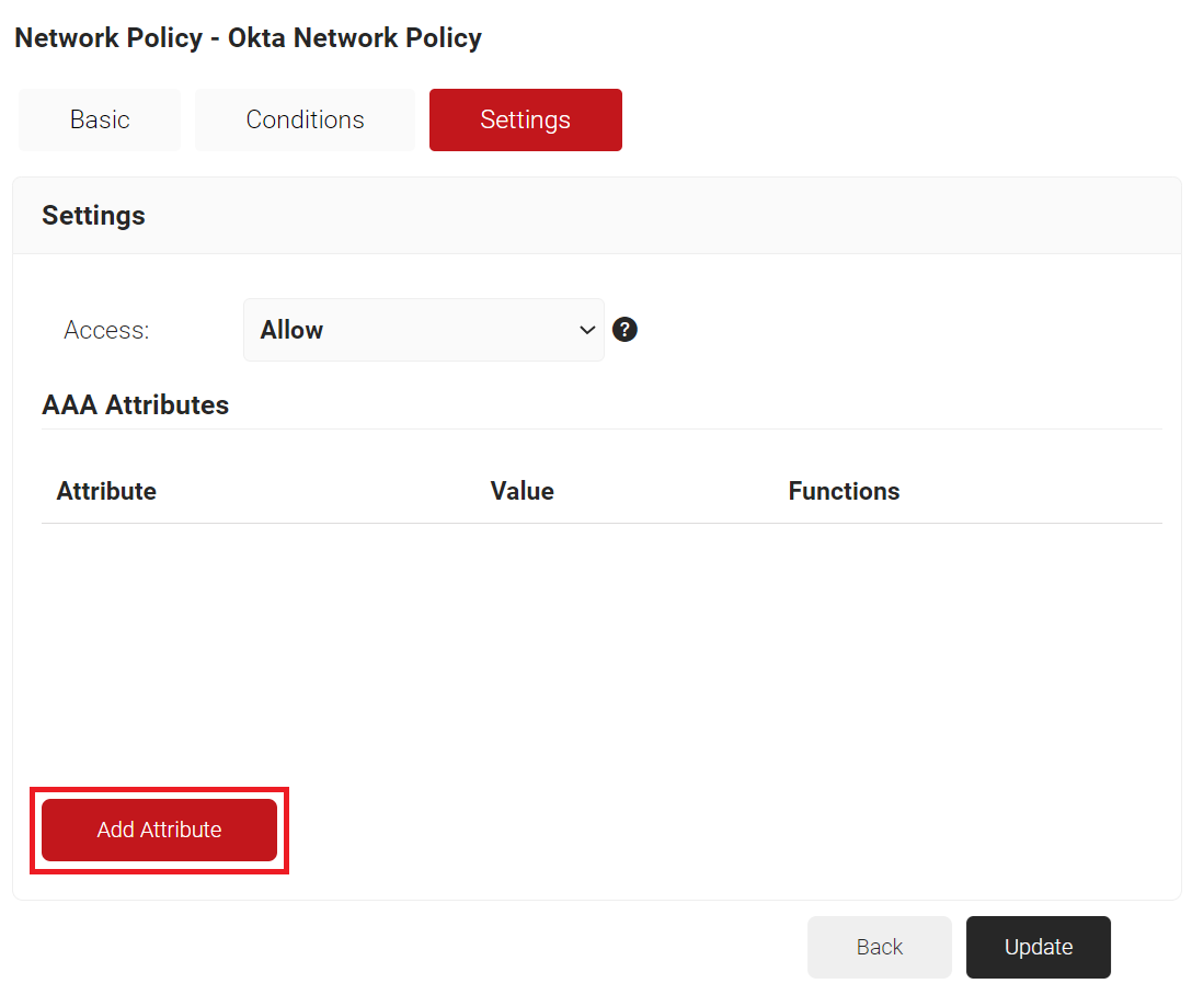 NOTE: You can assign a network policy to multiple user roles. - Select the Settings tab.