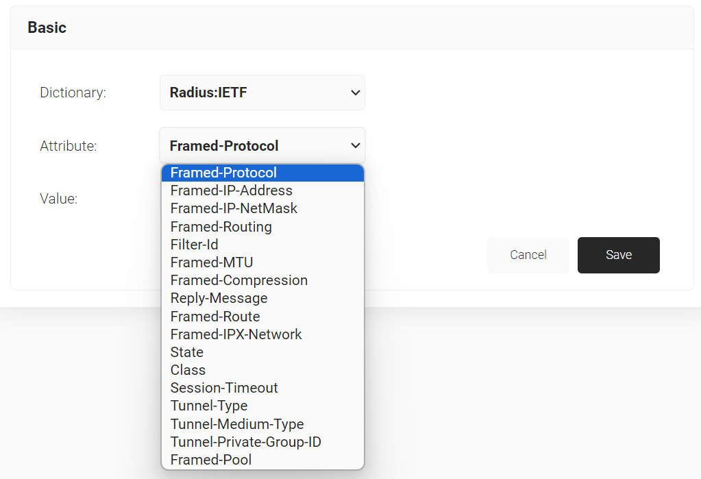 - From the Dictionary drop-down list, select an option: Radius: IETF or Custom.