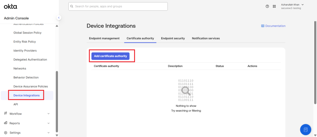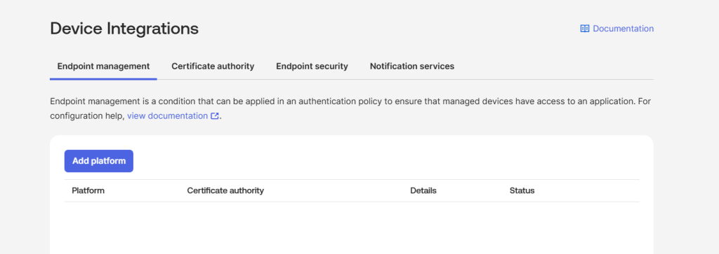 - In the Okta Admin Console, navigate to Security > Device integrations.