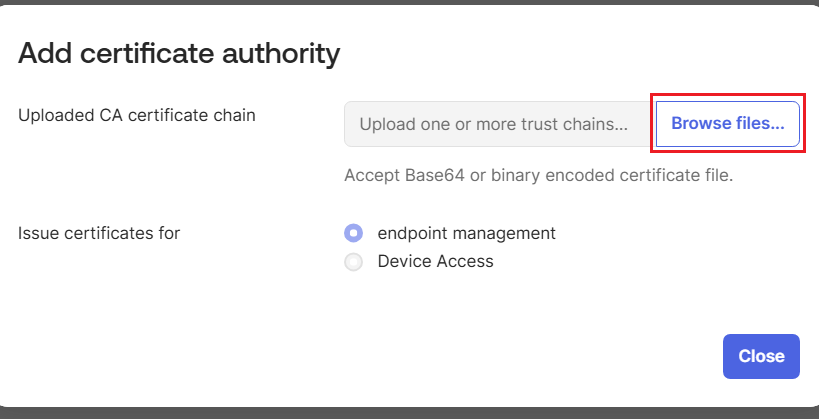 - In the Add certificate authority dialog box, click Browse files. Select the CA certificate exported from JoinNow portal in PEM format.