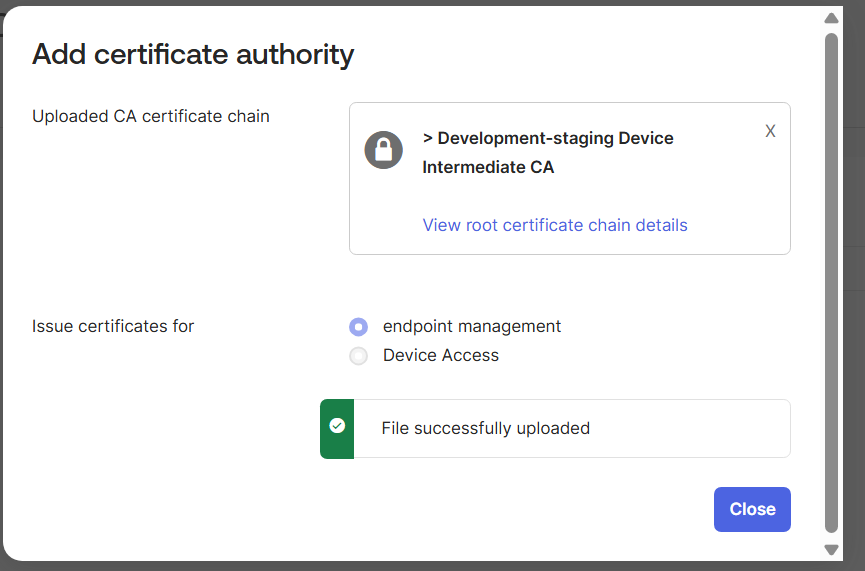Certificates are uploaded automatically. A message appears if uploads are successful. To view details, click View root certificate chain details. - Click Close.