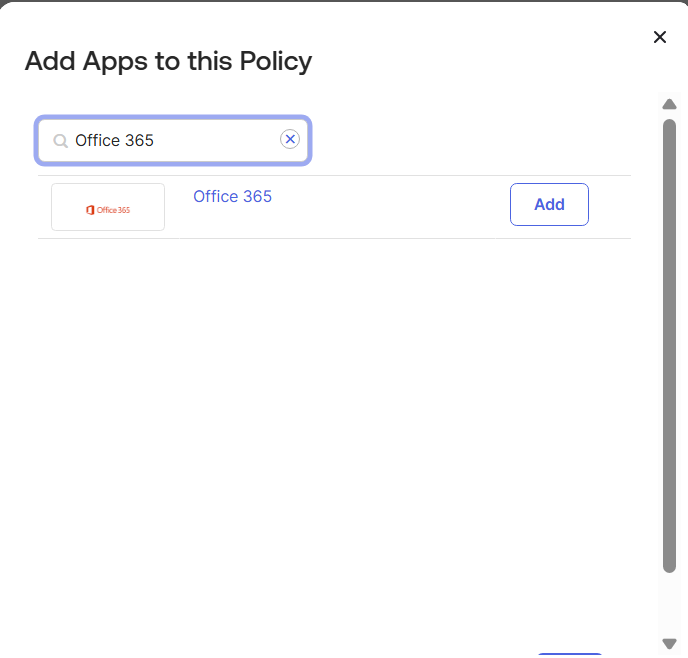 - In the search box, enter the name of the required application for which the policy must be mapped to. Click Add.