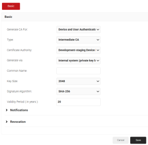 - In the Basic section, from the Generate CA For drop-down list, select the Device and User Authentication option to authenticate devices and users.