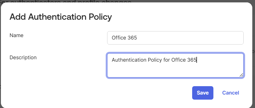 - Enter a name and description for the Authentication Policy. Click Save.