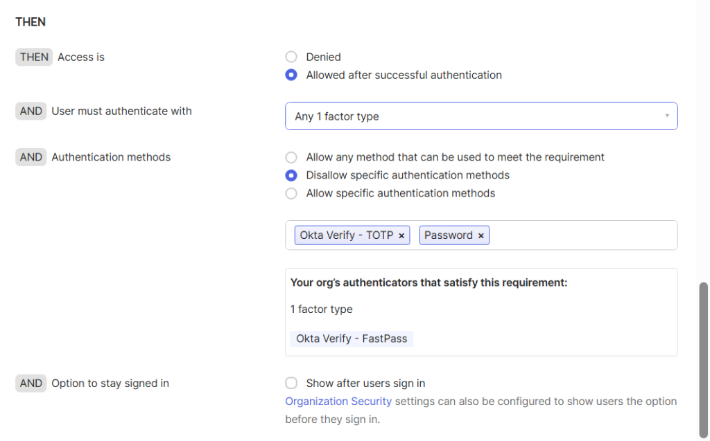 - Configure the appropriate THEN conditions to specify how authentication is enforced.