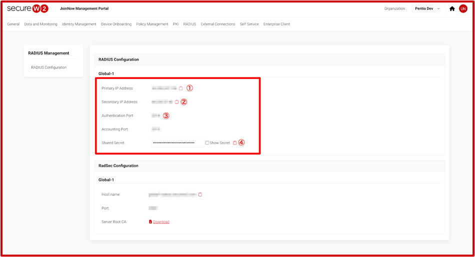 - On the JoinNow Management Portal, go to RADIUS > RADIUS Configuration and copy the Primary IP Address, Secondary IP Address, Port, and Shared Secret values to your console.