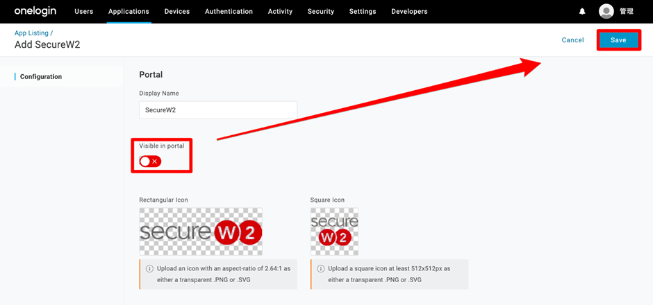 - In the OneLogin portal, navigate to the SecureW2 App Configuration screen and in the left pane, click Configuration.