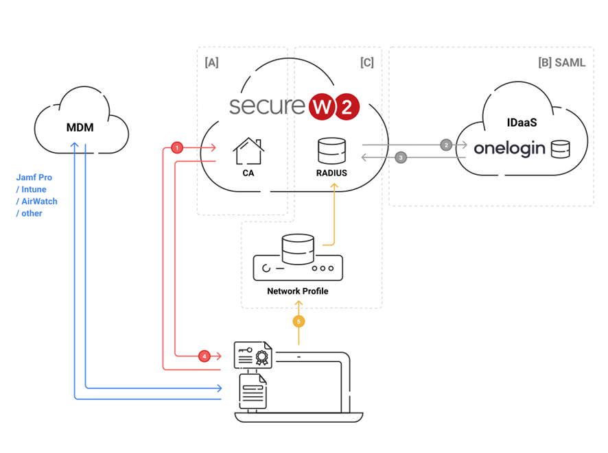 - SecureW2 delegates authentication to OneLogin and end users authenticate with OneLogin.