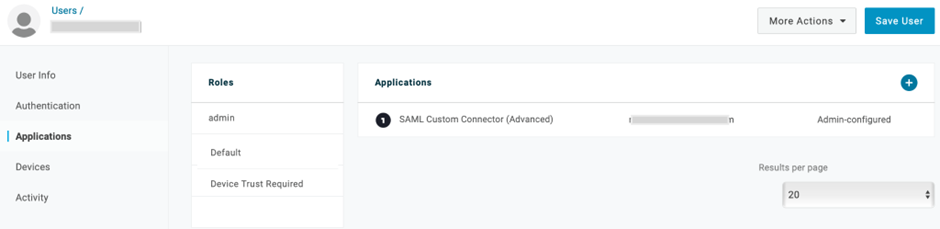 - From the Menu bar, select Users. A list of users is displayed.a. Select a user.b. On the displayed screen, on the left-side pane, click Applications.c. From the Roles column, select a role and click the + icon in the Applications column to add an application.