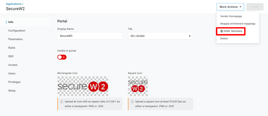 - The page will refresh. At the top-right corner, from the More Actions drop-down menu, select SAML Metadata and download it. This is required later.