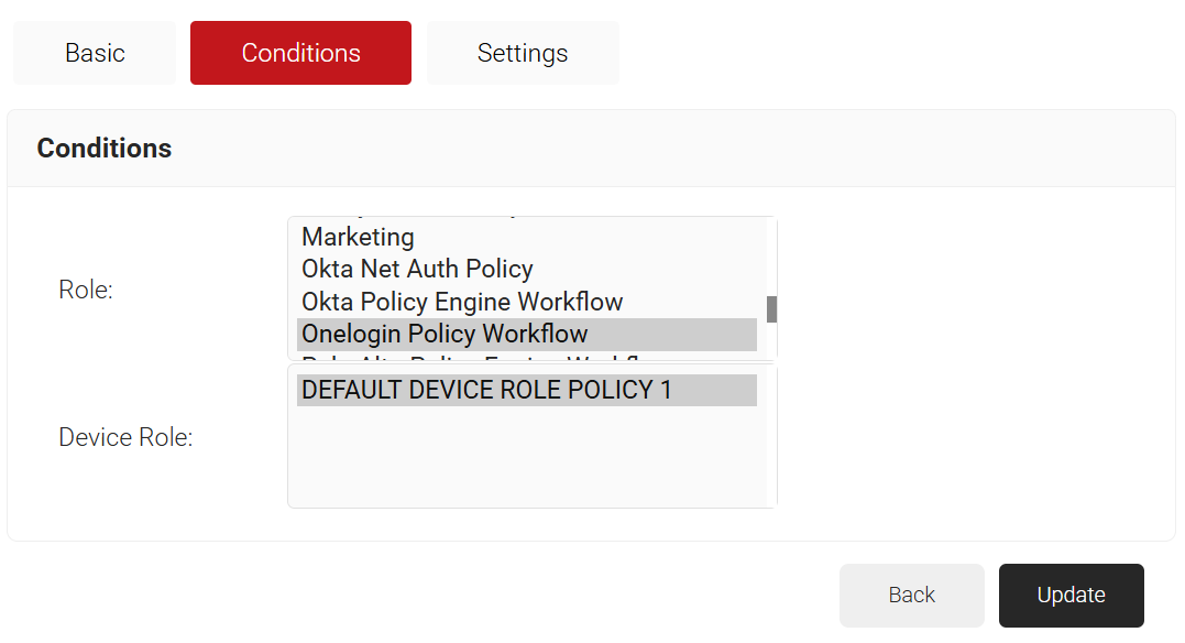 - Click the Conditions tab and from the Policy Workflow and Device Role drop-down lists, select the policies.