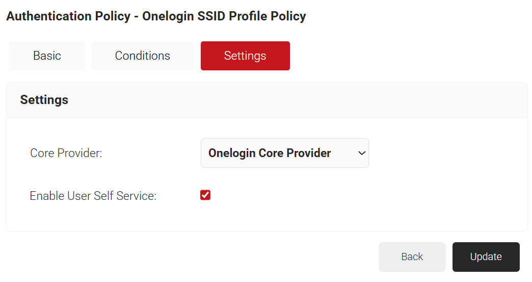The Authentication policy is what ties the Core Provider to the Network profile. Here, the newly created network profile uses the OneLogin Core Provider to enroll users for certificates and onboard them to the network.
